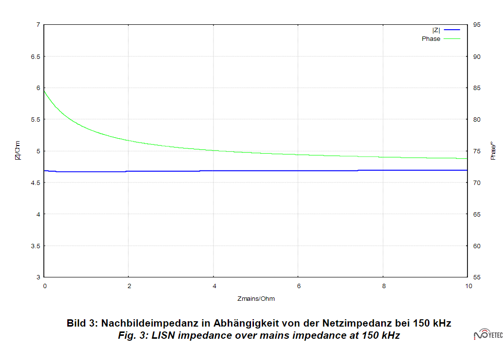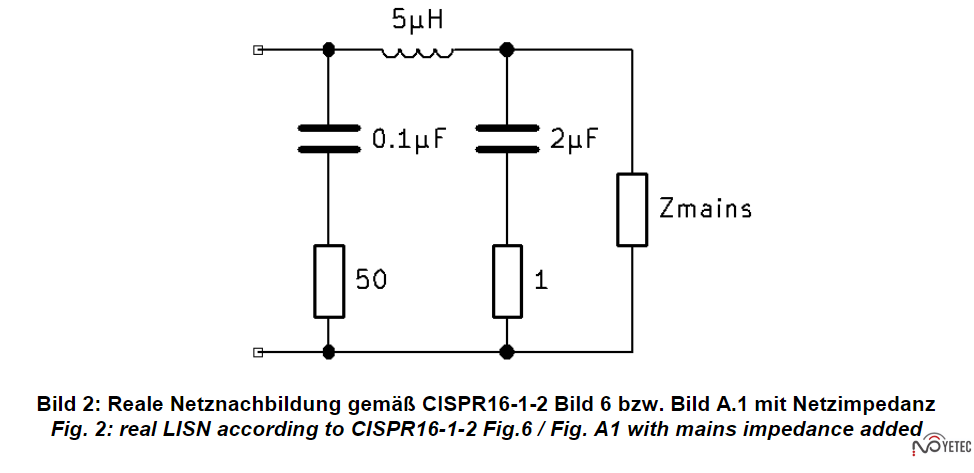 CISPR16-1-2:2014 section 4.5 defines the impedance of the LISN according to figure 1. Because of the high DC resistance, it cannot be put in series with the load, as the resulting voltage drop would be unac-ceptable. Therefore, it is required to modify the circuit to approximate the given imped-ance without putting a DC resistance in series with the equipment under test. CISPR16-1-2/Fig. 5 shows a possible solution. It is shown in simplified form in figure 2. The resistive part of the low-frequency impedance is connected in parallel with the power supply (via a decoupling capac-itor) assuming that the power supply im-pedance will always be greater than 1 Ω. Even when the power supply impedance is low there is nearly no impact on the magnitude of the LISN impedance. This does not hold true for the phase (see. figure 3).