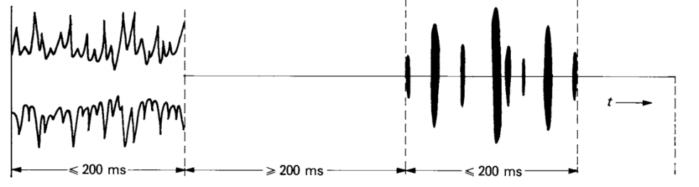喀呖声是指:超过连续干扰的允许值持续时间不大于 200ms,而且后一个干扰离前一个干扰至少为 200ms 的一种干扰。两个间隔时间与连续干扰允许值的电平有关。一个喀呖声可能包含几个脉冲。