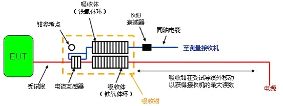 原理是对于小型EUT,引线上由共模电流引起的辐射发射,远远大于受试物表面向外的辐射。可以把 EUT 的电源线看作是一个辐射天线,此时骚扰功率近似等于吸收钳处于共模电流为最大值的位置是测量的 EUT 提供给受试线(LUT)的功率。为了找到“共模电流最大值”,需要吸收钳能移动,因此在测试系统中需要有一个长度为 6 米的吸收钳滑轨。